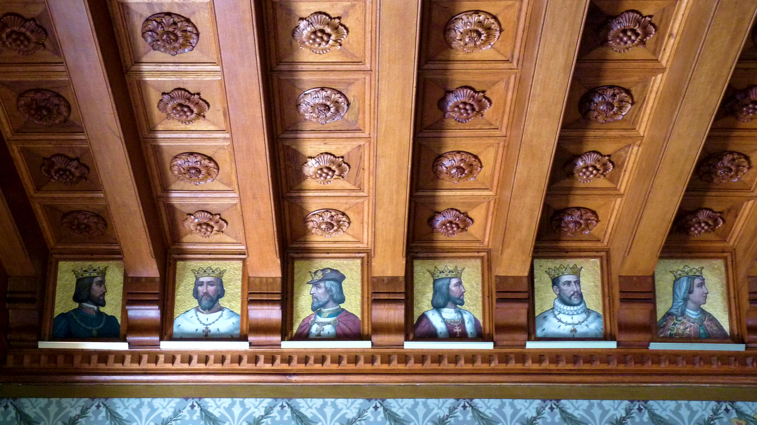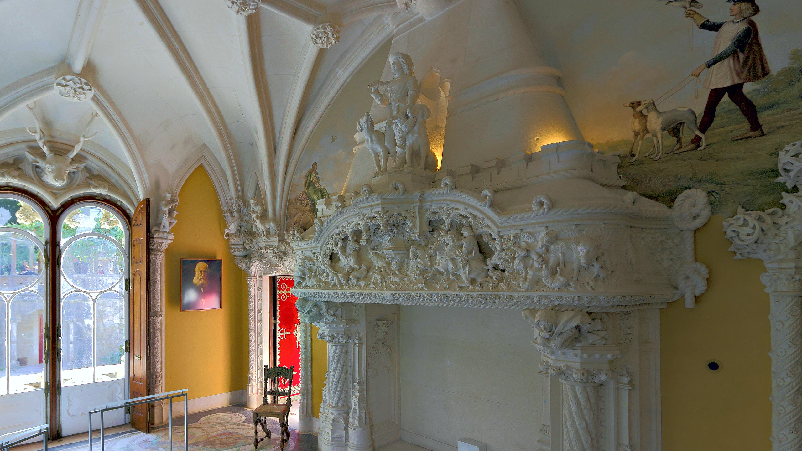 The dining room is overwhelmed by the massive fireplace that supports a statue of a woodsman. The mantelpiece depicts hunting scenes that are exceptionally well carved.