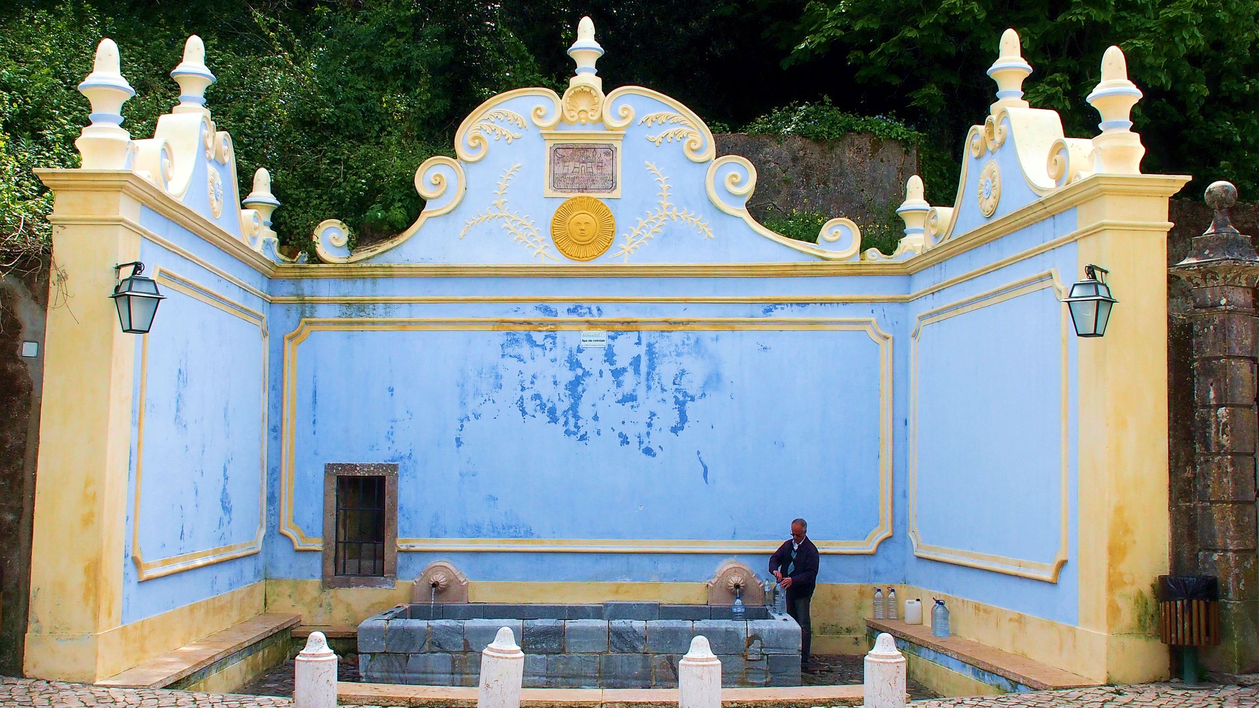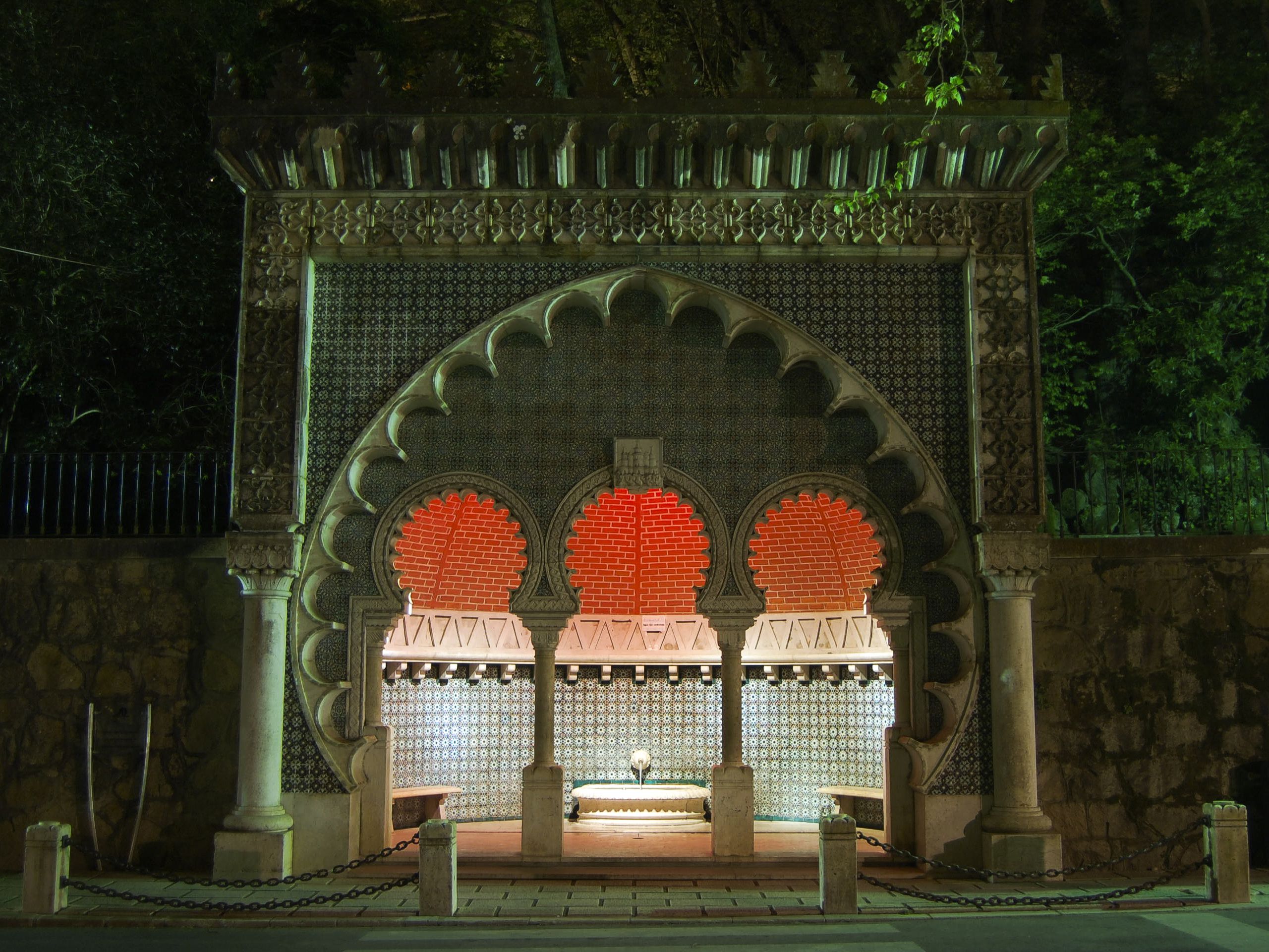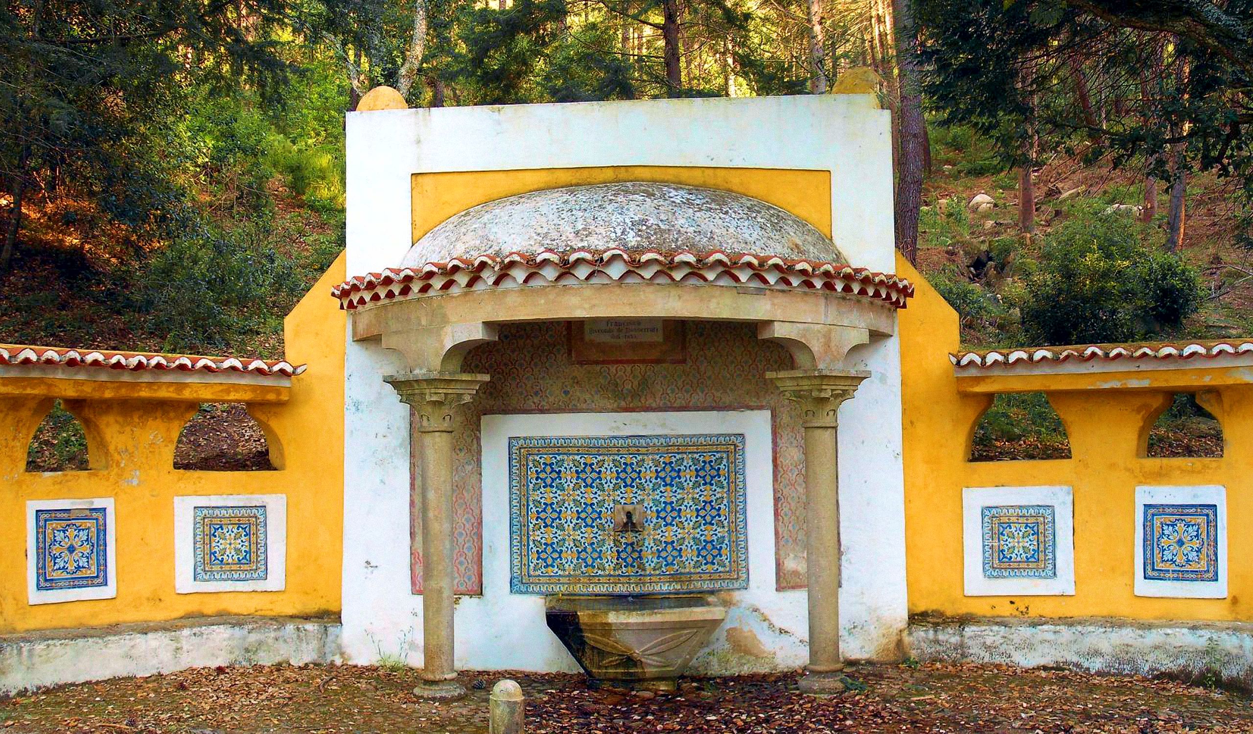 This large elegant fountain of Neo-Romantic style was designed in 1922 by a master sculptor of Sintra, José da Fonseca, with Arabic features, decorated with neo-Mudéjar Azulejos , and colourful stucco works.